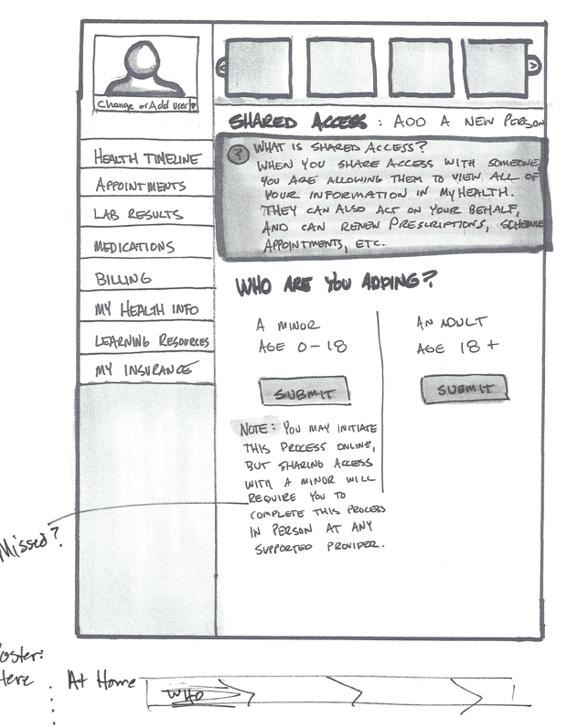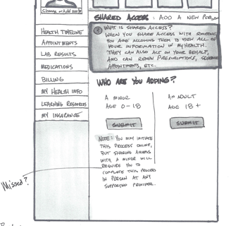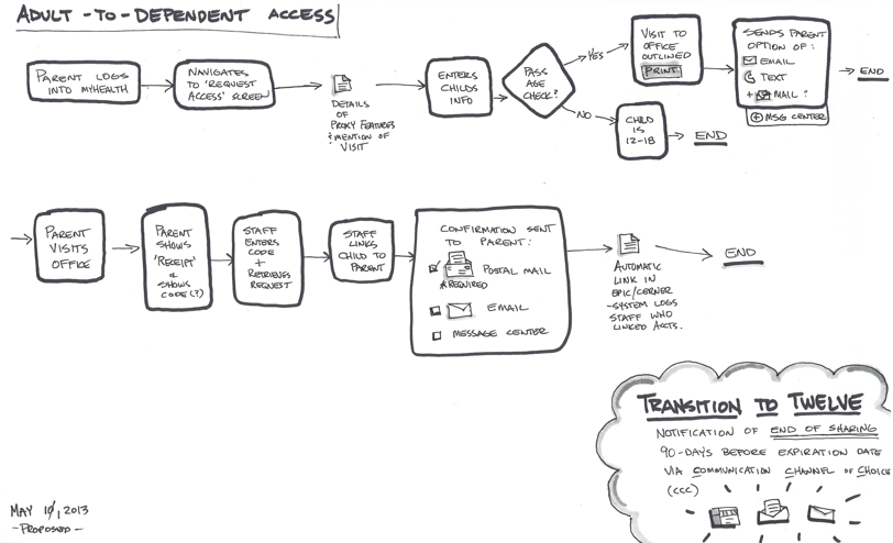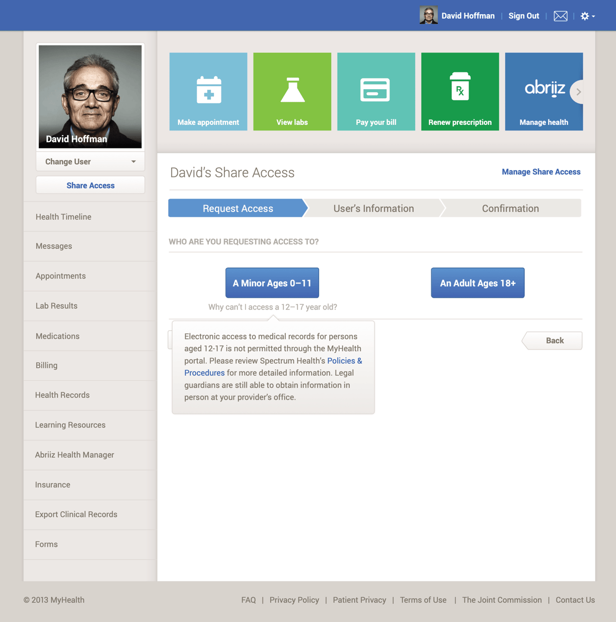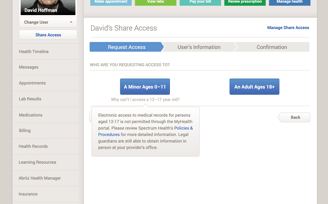User flow that shows process for an adult granting shared access to a dependent to view each others health records.